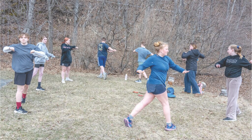 Sharon Academy Track & Field athletes warm up before learning how to throw the discus. Pamela R. White Photo