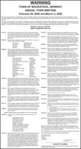The legal voters of the Town of Woodstock are further notified and warned that a public informational hearing to explain and discuss the articles that will be voted on by Australian ballot (Articles 9-25) will be held at Town Hall Theatre on the 28th of February 2026, following the discussion of, and voting on, Articles 1-8 from the floor at 10:00 A.M. No changes to the articles to be voted by Australian ballot can be made during this meeting.