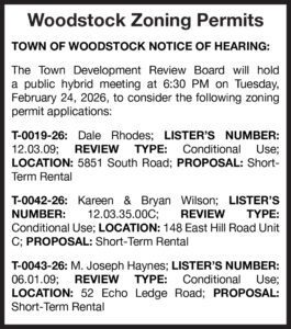 The Town Development Review Board will hold a public hybrid meeting at 6:30 PM on Tuesday, February 24, 2026, to consider the following zoning permit applications:
